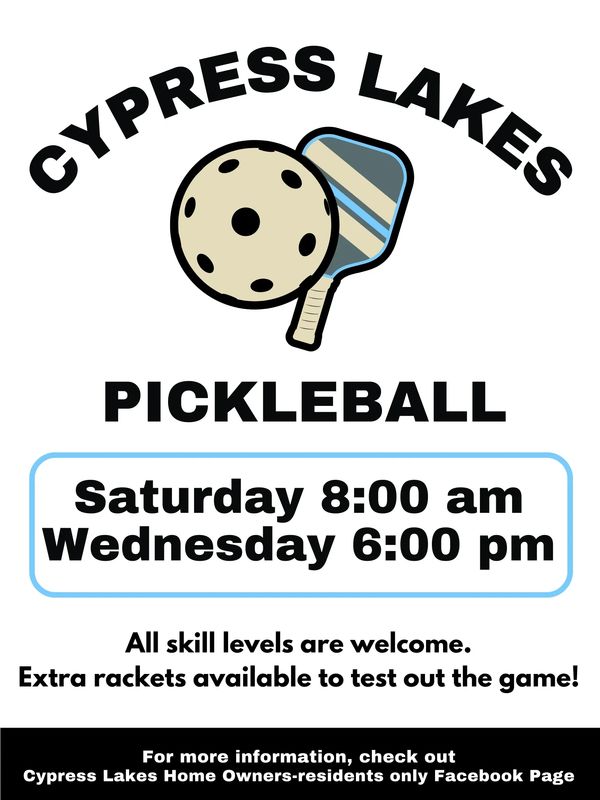 The Cypress Lakes Pickleball Club meets every week on Wednesday's and Saturdays. All skill levels welcome!!